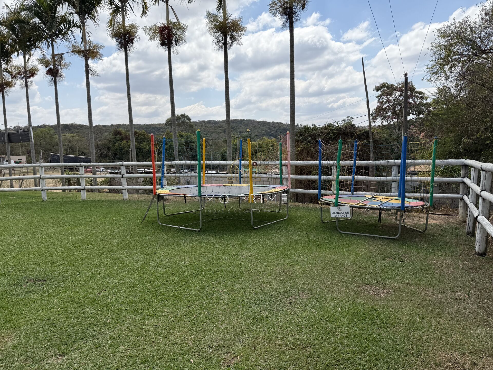 Área de lazer com piscina, cama elástica e até um cavalinho para diversão das crianças.